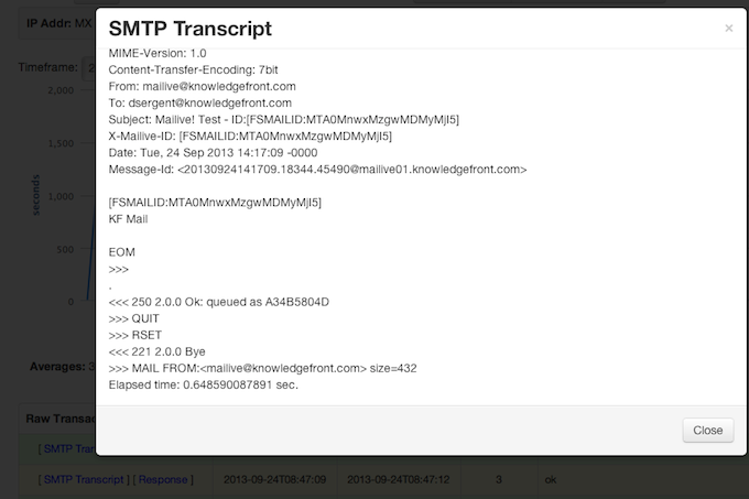 For each test Mailive! performs both the outgoing SMTP session and returned response are stored for review and to aid in troubleshooting. Mailive! will also perform analysis on the headers of the response to show where possible delays are occurring.
